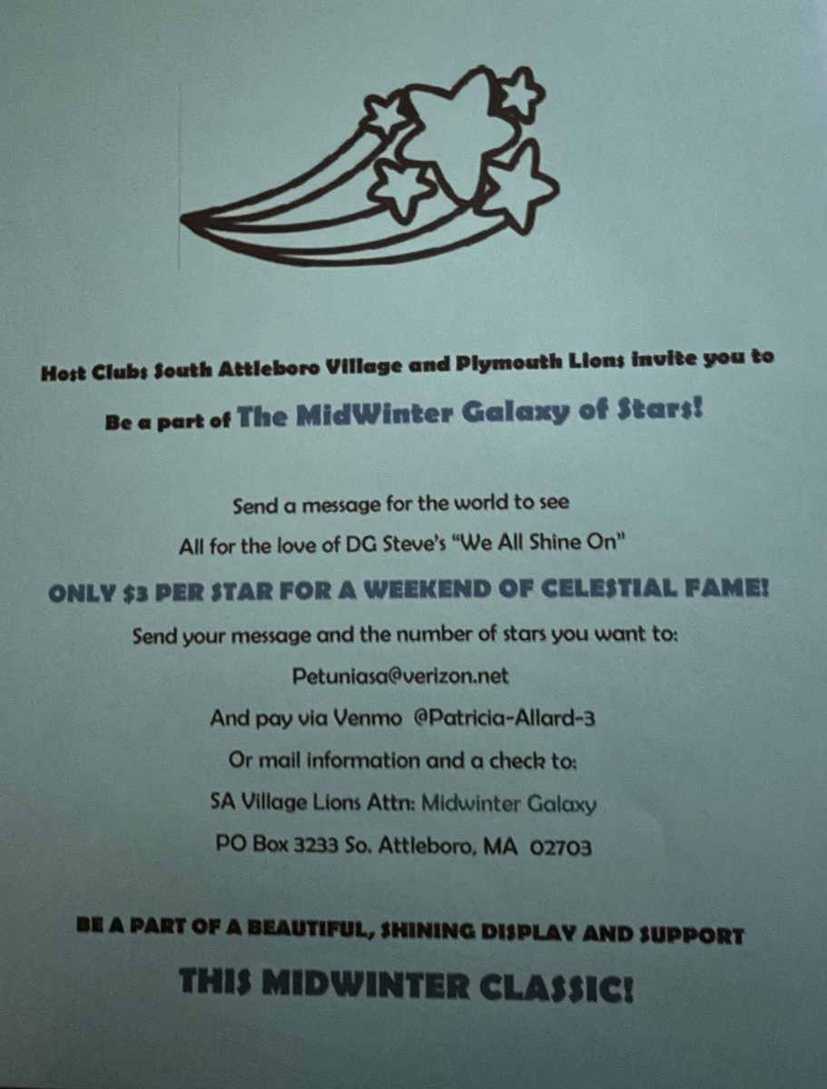 Midwinter @ Doubletree Hyannis, 287 Iyannough Rd Raynham Lions Club, 2234 King Philip St, Raynham, MA 02767 DoubleTree by Hilton, 287 Iyannough Road, Hyannis, MA 02601 Loon Pond Lodge at Ted Williams Camp, 28 Precinct Street, Lakeville, MAWe All Shine On